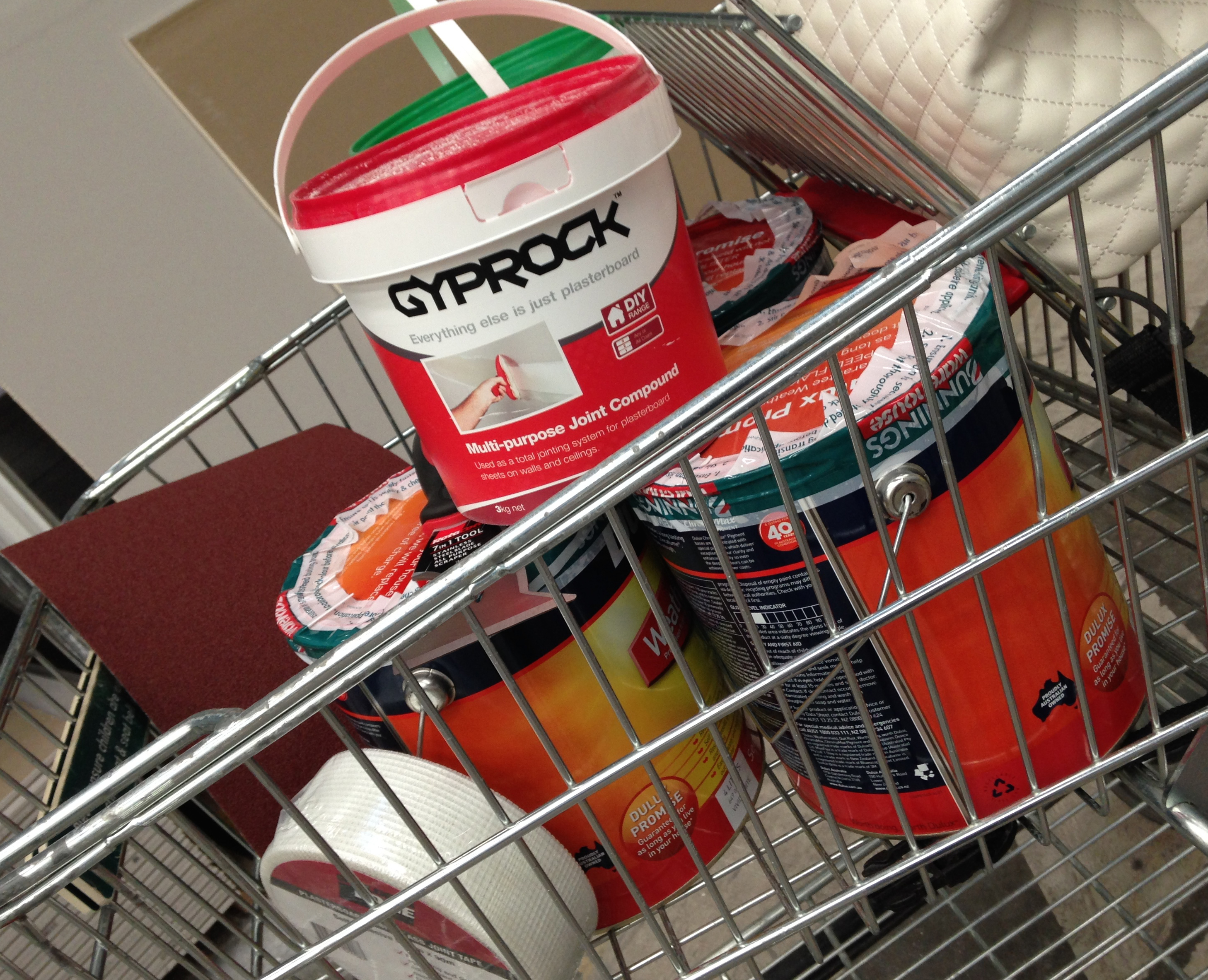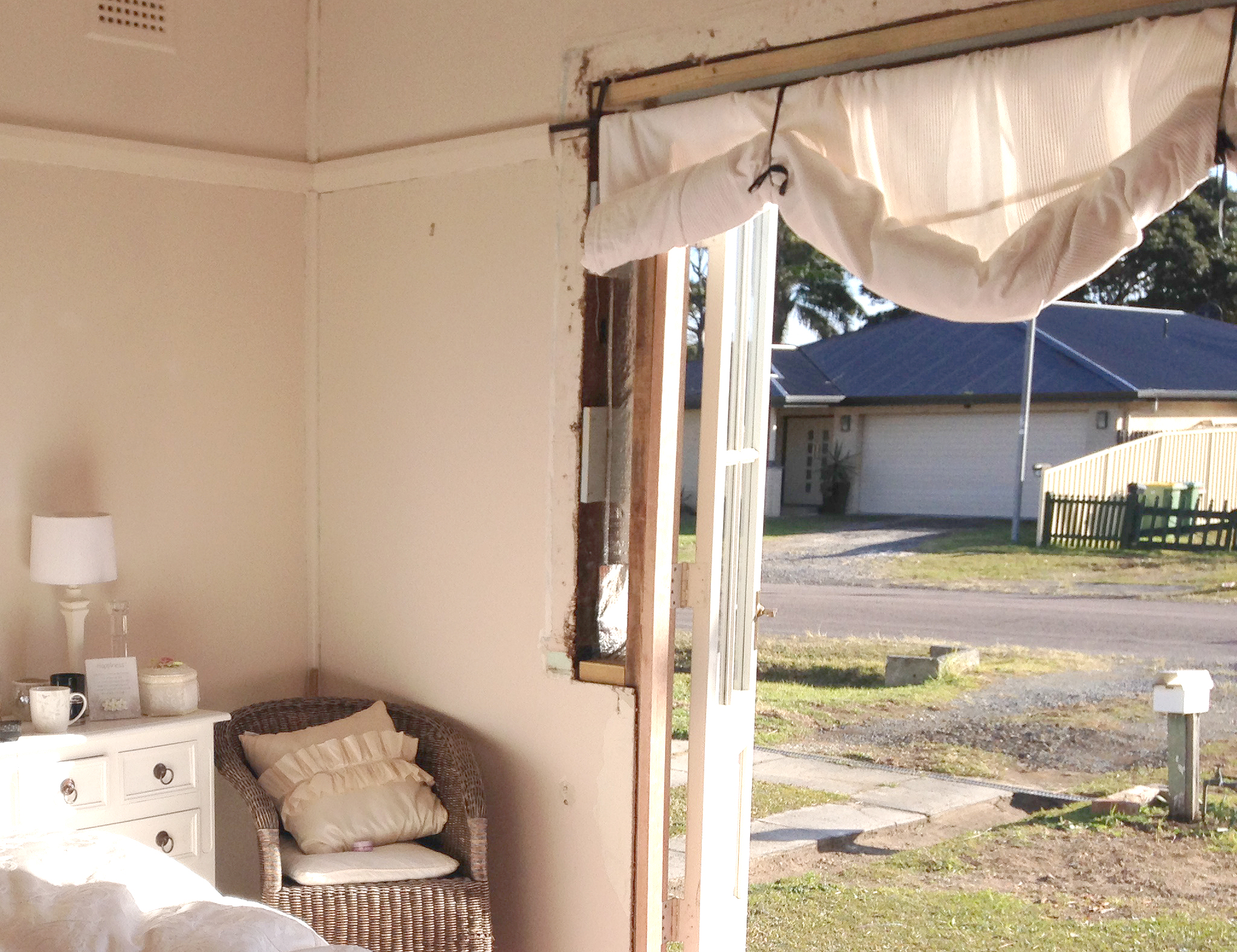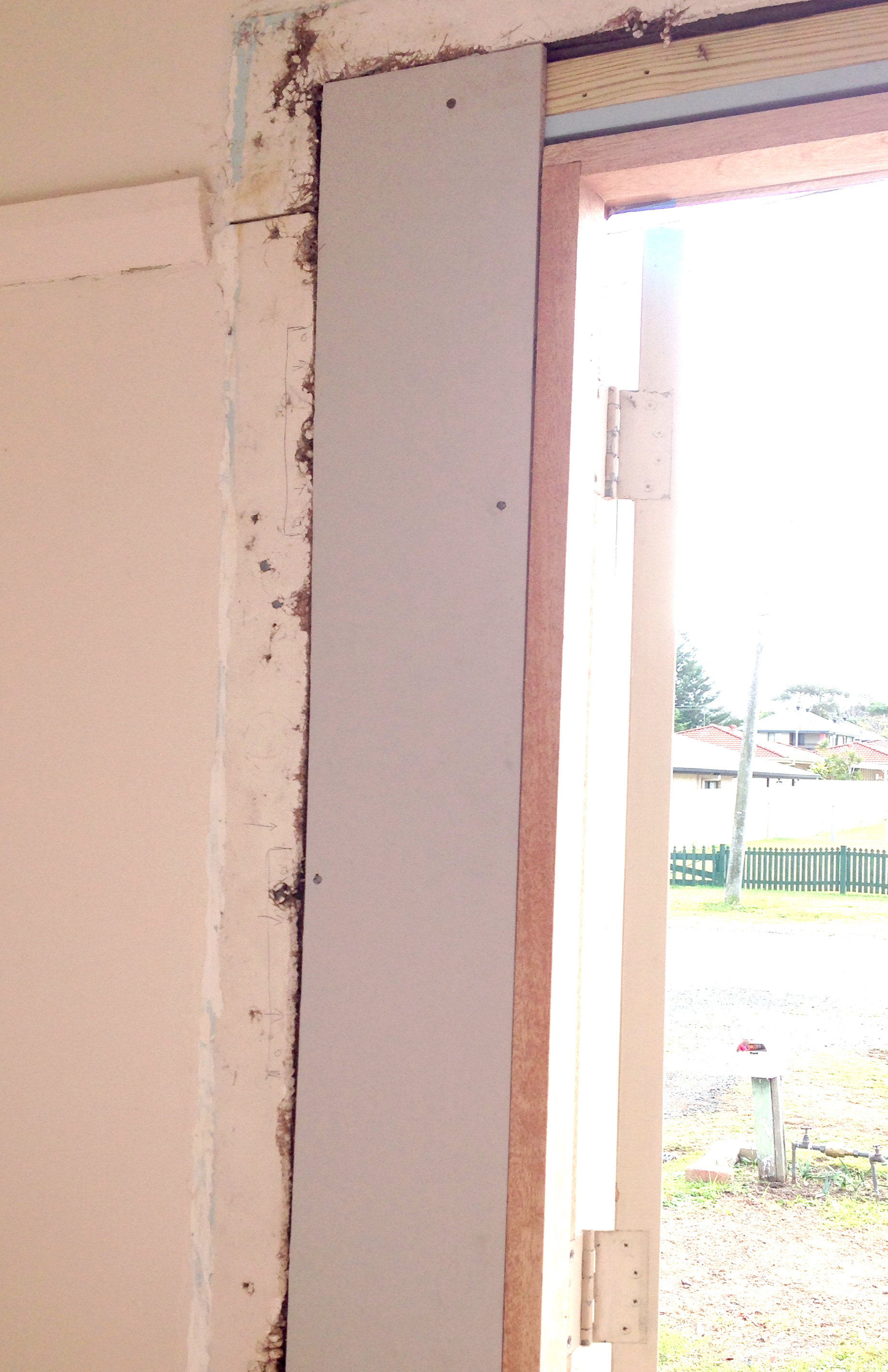 In the meantime there were a few more things I wanted to do before the HSH returns. The interior walls around the newly installed french doors need fixing with gyprock. I had already purchased all the necessary bits and pieces on my last shopping spree at Bunnings so I was ready to start plastering. (Oh and btw, I bought myself a new tool. I’m so excited about it. It’s a sliding compound saw!! – more about this another time) I cut the gyprock to size, nailed it in and applied the first layer of plaster to fill the gaps. I then used the plaster tape on the joints and applied another coat of plaster. What a difference fixing the gaping holes makes to the look of the doors, not to mention the chilly draft that has been blasting through the gaps for the last three weeks! A good sand, followed by another coat of plaster and I’m done. Ready for the architraves around the doors.