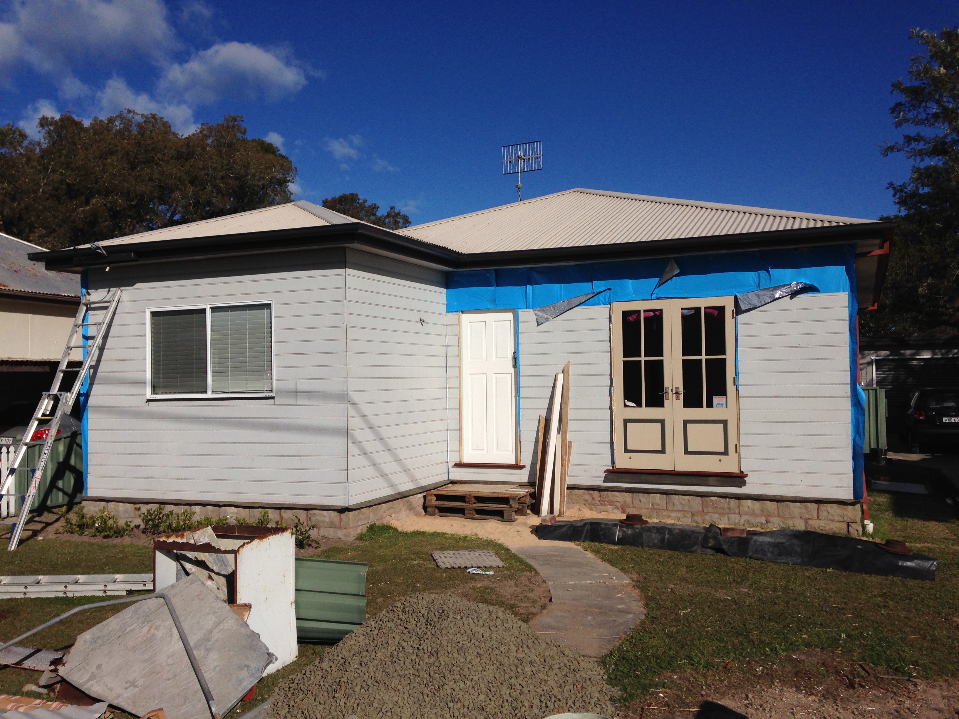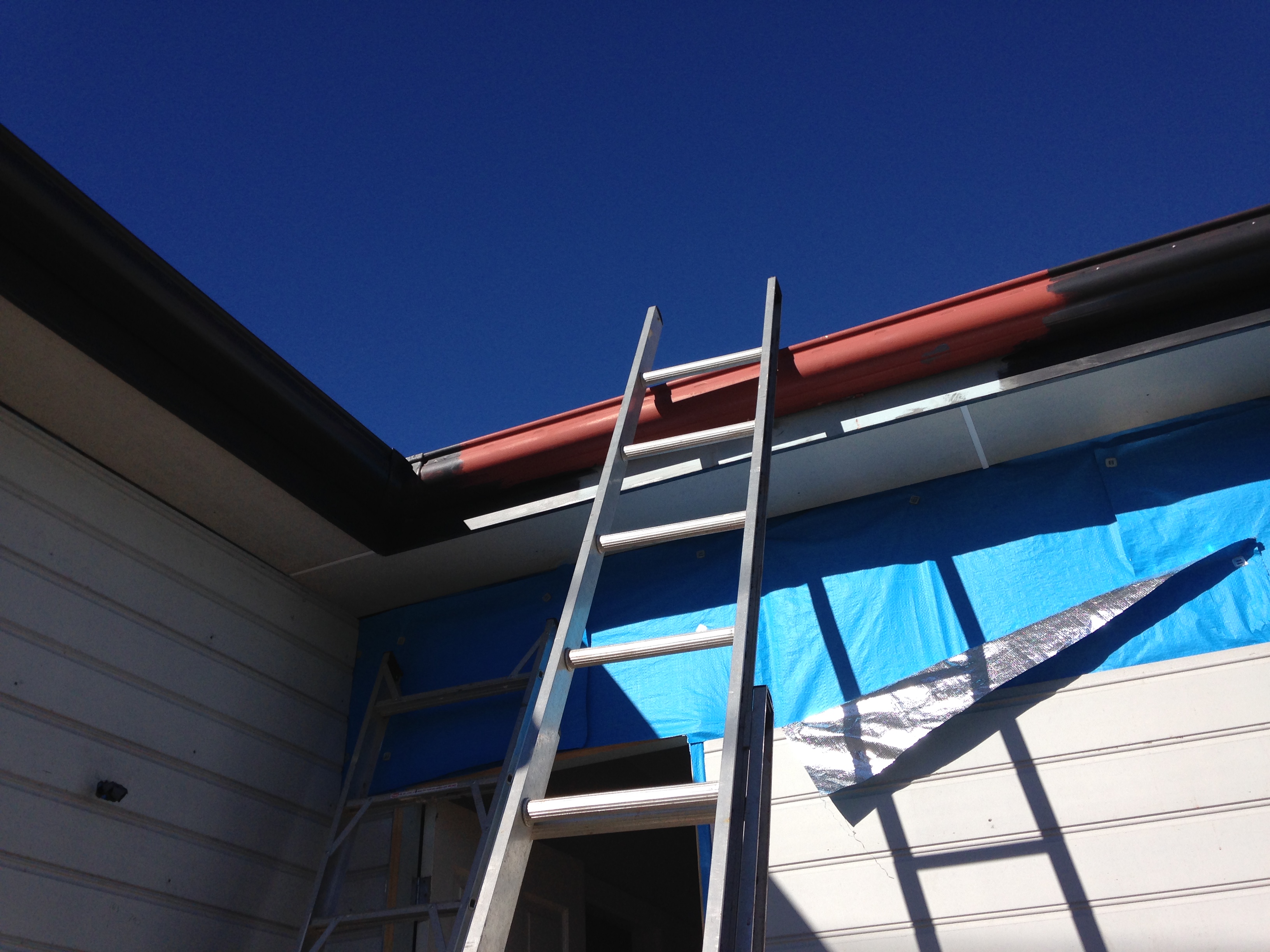 We are planning on building the deck once the remainder of the cladding is finished and all the trims are fixed around the window and door frames. The HSH is arriving at 8am tomorrow morning. I worked all day today on the house on my own in order to be ready. I have undercoated the eaves, and applied two coats of paint to the gutter and fascia. I have chosen a Dulux colour called Domino. It is charcoal and looks very smart. Covering the rust red has made such a difference to the appearance of the house. I need to complete the eaves before we build the roofing over the deck otherwise they won’t be accessible.