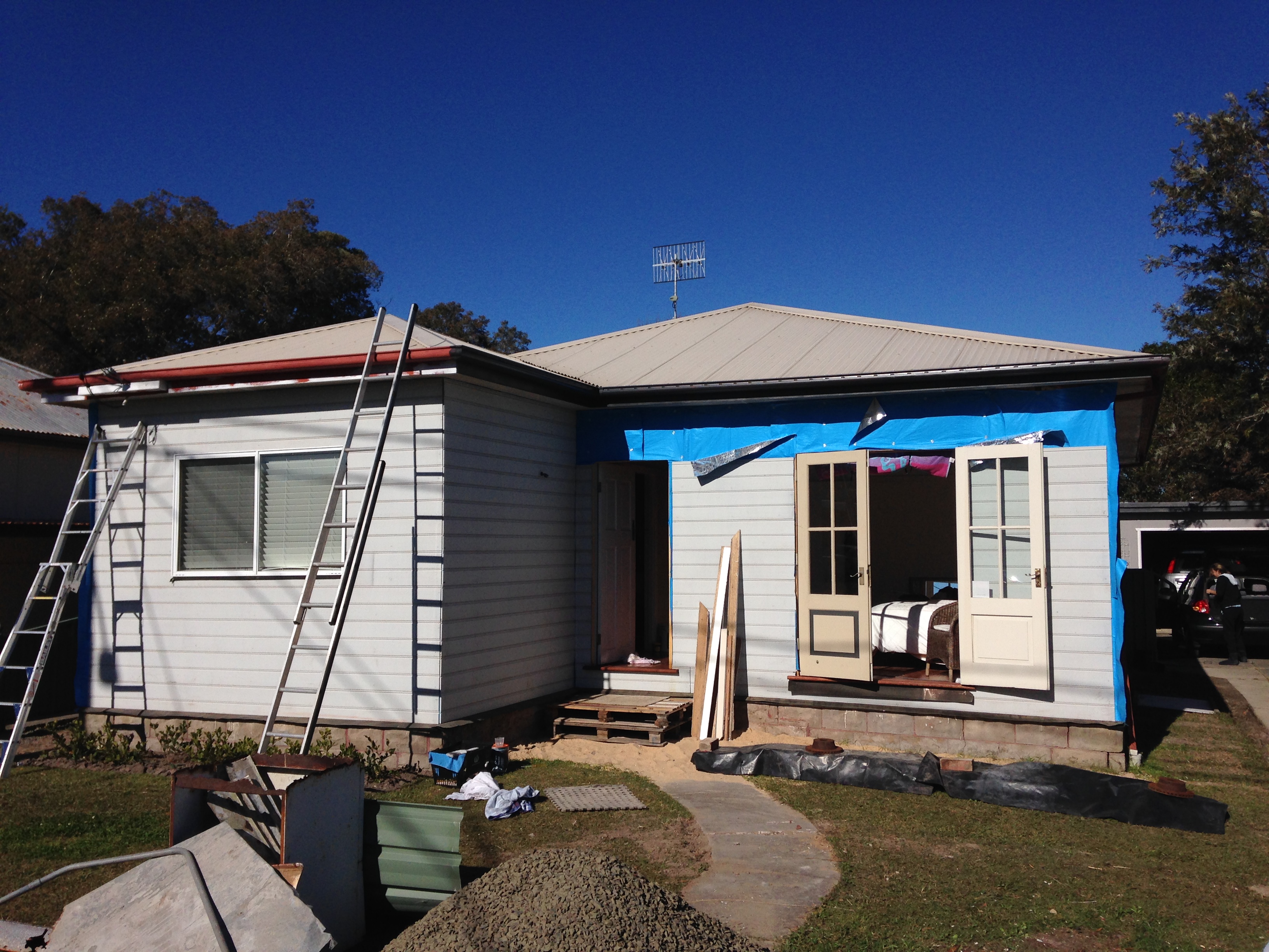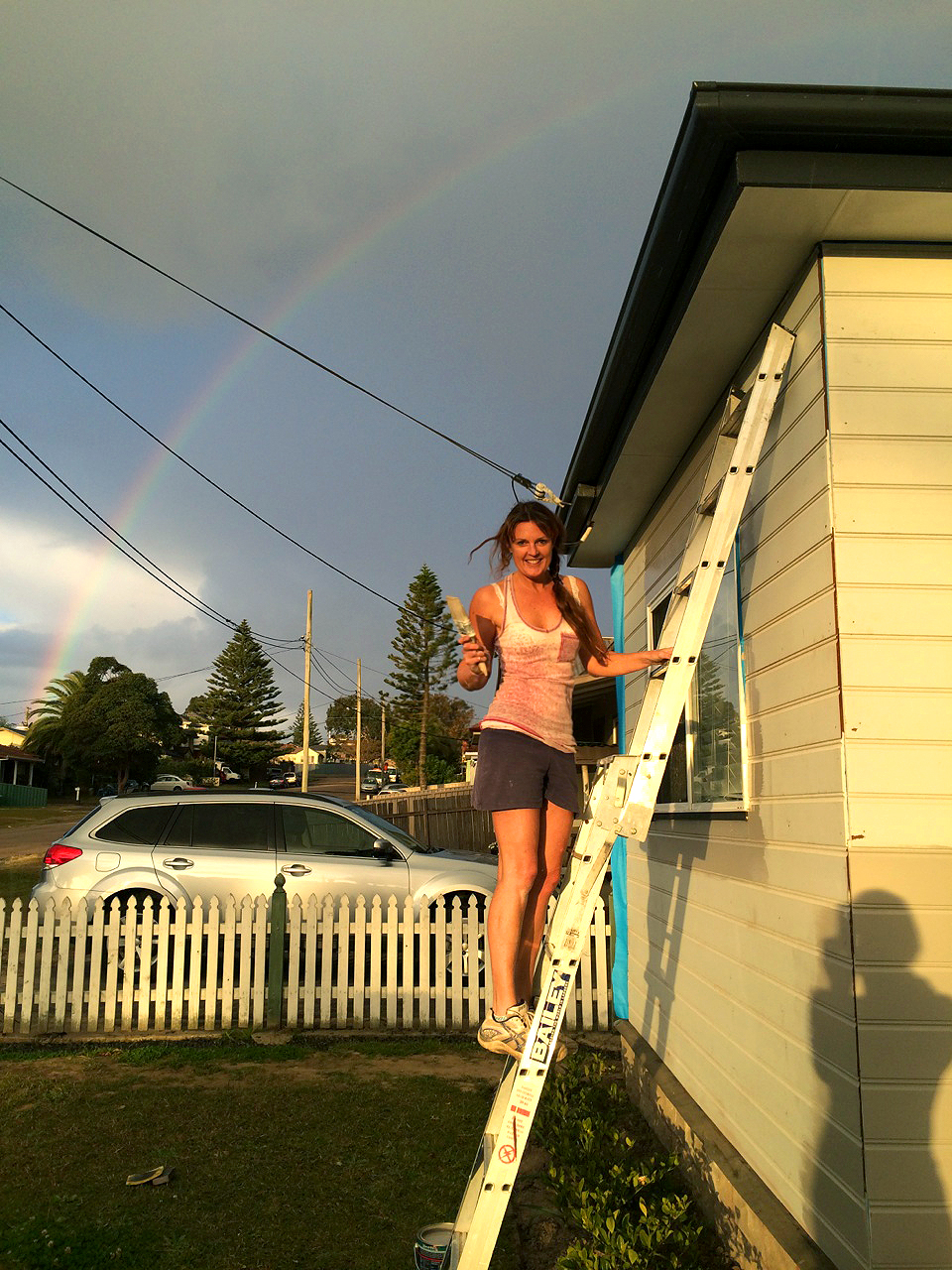 I also applied my chosen house colour in patches on the front of the house. The colour is called Solid Stone. I must say it doesn’t look how I imagined it. It looks completely different to the test I did on the garage, where it looks a neutral, sort of military grey colour but on the front it has a warmer appearance. However, I will persevere with it and do one coat over the entire front façade before I make any decisions to change it. It was late in the afternoon when I applied it. The sun was going down over the lake at the end of my street to my right and on my left was an amazing rainbow. Out of nowhere it had started to rain! Again!! (surprise surprise). I am after a neutral grey/stone. I need to see the colour in different light throughout the day. Sophie has been with me all day…in bed asleep most of the day, watching movies and reading her book. A teenager on Uni holidays! She dragged herself out of bed to take this photo!